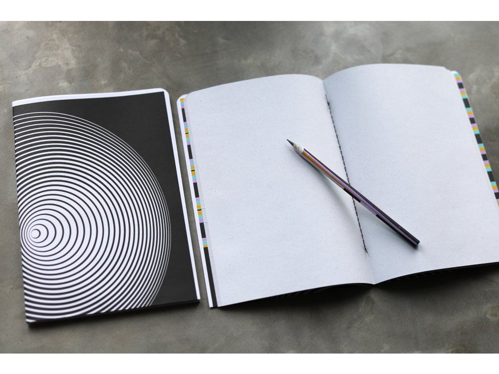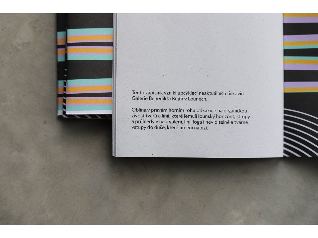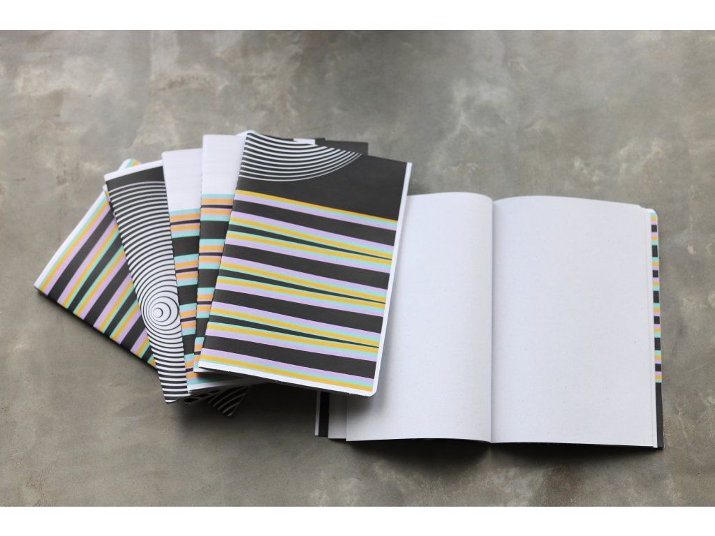 Autorský sešit formátu A5 vznikl upcyklací neaktuálních galerijních tiskovin – plakátů, pozvánek i dalších materiálů. Každý kus je ručně vyrobený ve spolupráci s ostravským studiem Papidu a nese jedinečný vizuální charakter.